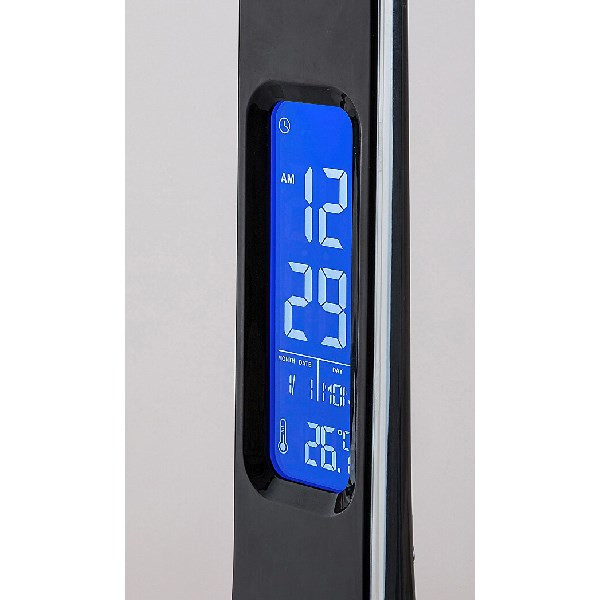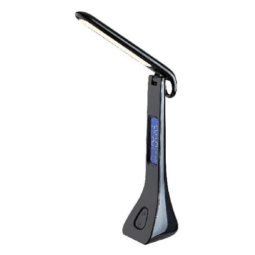 A modern stílusú Amato asztali lámpa stílusos megjelenésével és sokoldalúságával tökéletes választás a dolgozószobába vagy bármely íróasztalra a lakásban. A teljes egészében műanyagból készült, fekete színű okos lámpa fehér búrával, alul kiszélesedő, robusztus dísztalppal és állítható lámpafejjel rendelkezik. Az Amato szárán elhelyezett LCD kijelző mutatja a hőmérsékletet, az időt, továbbá öröknaptár és ébresztő funkcióval látták el. A lámpa a G energiaosztályba tartozó beépített LED fényforrást tartalmaz, amelynek a teljesítménye 7 W, fényereje búrával 340 lumen, búra nélkül 530 lumen, élettartama pedig 25 000 óra. A 4000 K színhőmérsékletű fényforrás természetes fehér fényt bocsát ki. Az Amato asztali lámpa érintőkapcsoló segítségével dimmelhető, azaz fényereje állítható (10%, 40%, 100%). A lámpa méretei a következők: szélessége 170 mm, magassága 440 mm, a kábel hossza 1000 mm.