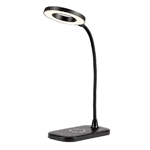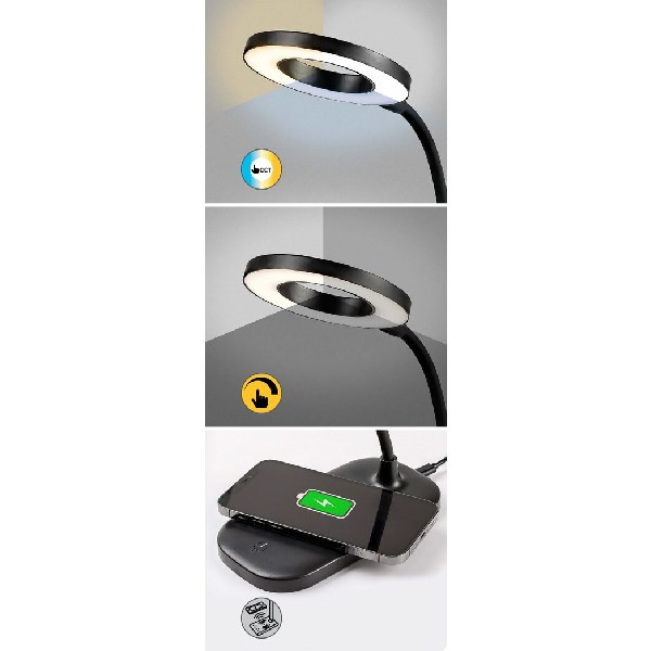 A modern Hardin asztali lámpa számos extra funkciójával nélkülözhetetlen társa lesz a dolgozószobában vagy bármely íróasztalnál. A teljes egészében műanyag okos lámpa fekete színben fehér búrával készül, a lámpafej fánk formájú, a téglalap alakú dísztalp lekerekített sarkakat kapott. A Hardin a G energiaosztályba tartozó beépített LED fényforrással rendelkezik, amelynek a teljesítménye 5 W, fényereje búrával 210 lumen, búra nélkül 720 lumen, élettartama pedig 20 000 óra. A lámpa színhőmérséklete 2700–6000 K között változtatható, azaz beállíthatunk meleg, természetes vagy hideg fehér fényt. Utóbbi különösen alkalmas munkavégzéshez, tanuláshoz. Ezenkívül a lámpa dimmelhető, azaz fényereje is változtatható. A színhőmérséklet és a fényerő a talpon elhelyezett érintőkapcsoló segítségével állítható. A Hardin vezeték nélküli töltővel rendelkezik, valamint USB-kábel segítségével tölthető. Az asztali lámpa méretei a következők: magassága 290 mm, átmérője 100 mm, beépítési mélysége 165 mm.