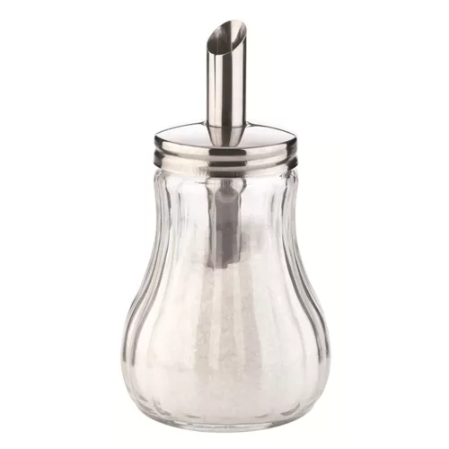 Üveg cukortartó, rozsdamentes fém adagoló fejjel.