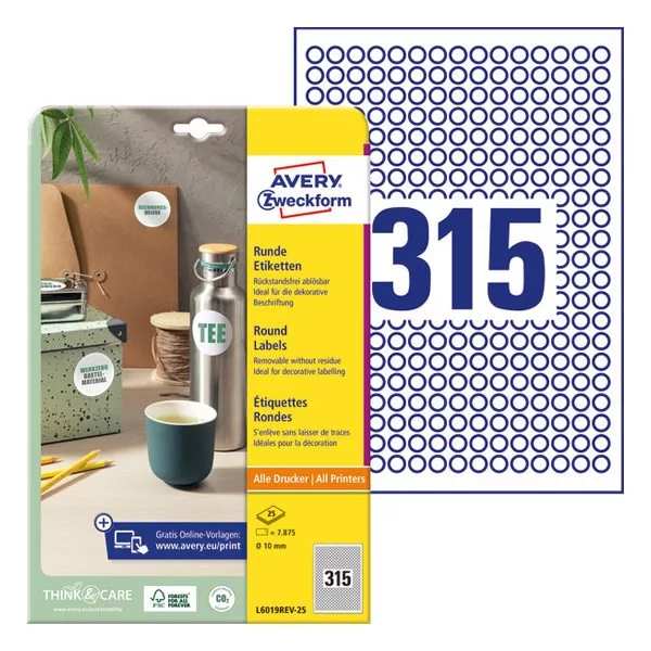 Etikett AVERY L6019REV-25 10mm kör univerzális