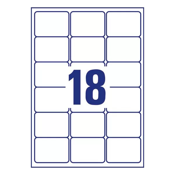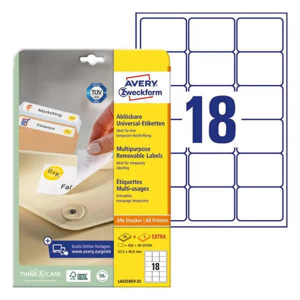 Etikett AVERY L6025REV-25 63,5x46,6mm univerzális visszaszedhető fehér 540 címke/doboz 30 ív/doboz