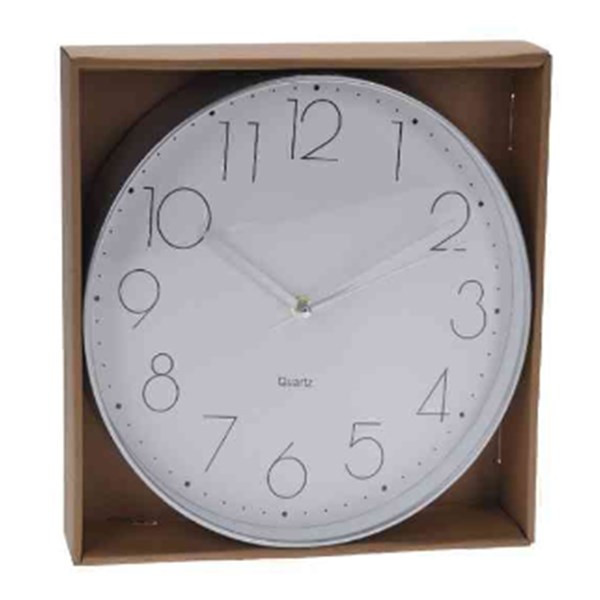 Falióra 30 cm átmérővel. Fehér hátlappal, halványabb fekete számokkal.