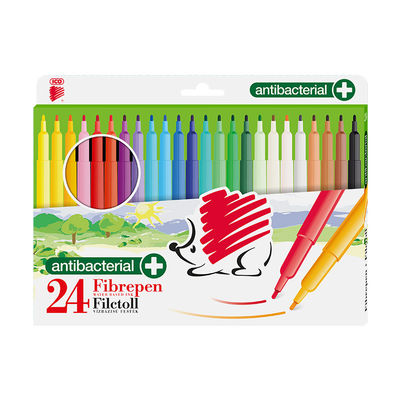 Antibakteriális rostirón vízbázisú festékkel töltve, átlevegőzős biztonsági kupakkal, rajzolásra, színezésre. A műanyag alkatrészek antibakteriális védelmet adó Biomaster ezüst-ionokat tartalmaznak (biocid hatóanyag: ezüst-foszfát üveg). Az ICO Antibakteriális termékei bizonyítottan baktériumölő tulajdonsággal rendelkeznek, a felszínen megtelepedett kórokozók 24 óra leforgása alatt, 99,9% hatékonysággal elpusztulnak. Az antibakteriális hatást az angliai Industrial Microbiological Services Ltd. bevizsgálta és igazolta. Regisztrációs szám: 3264423. Vonalvastagság: 1 mm.