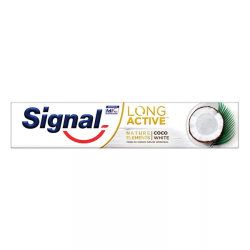 A Signal Long Active Nature Elements természetes kókusz kivonatot tartalmaz, segít visszaállítani a fogak természetes fehérségét és egész nap védi a fogakat a reggeli és esti fogmosás között.