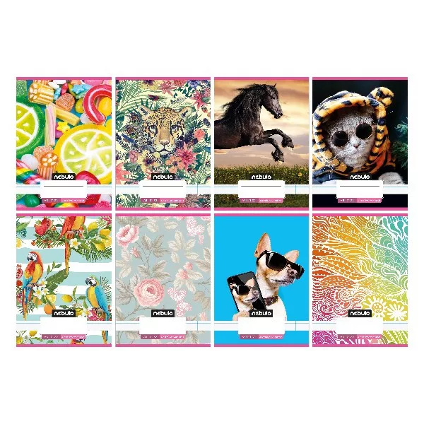 A/5-ös tűzött iskolai füzet 4. osztályos vonalazással, 32 lapos (21-32). 16 db füzet (8 különböző cuki minta, azaz 2db/minta) van egy csomagban. 70 g-os füzetlapok és 200 g-os műnyomó borító fényes fóliával.