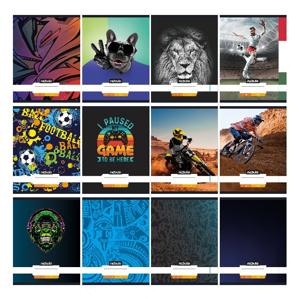 A/4-es tűzött iskolai sima füzet, 32 lapos (80-32). 12 db füzet (12 különböző minta) van egy csomagban. 70 g-os füzetlapok és 200 g-os műnyomó borító fényes fóliával.