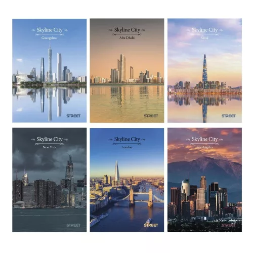 Karton borítású "Skyline" A/5 54 lapos vonalas füzet margóval füzet, különböző országok mintáival, vegyes csomagban