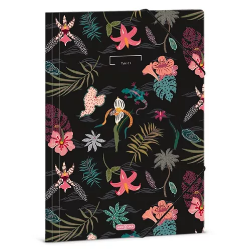 A/4 méretű gumis dosszié iratok, füzetek tárolására. 350 gr-os vastag kartonból készült dosszié lekerekített első sarkokkal, színes gumi zárópánttal. Külseje négy színnel, fényes fóliával nyomott. Belső oldala nyomatlan.