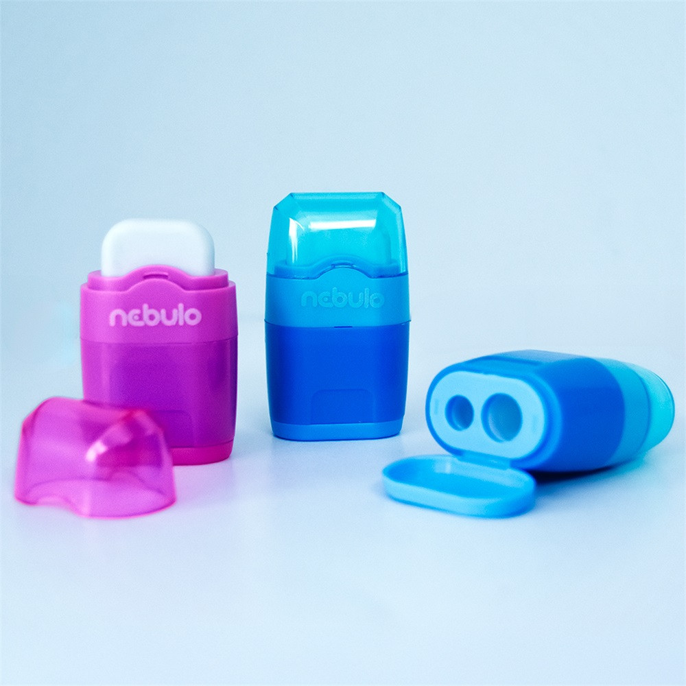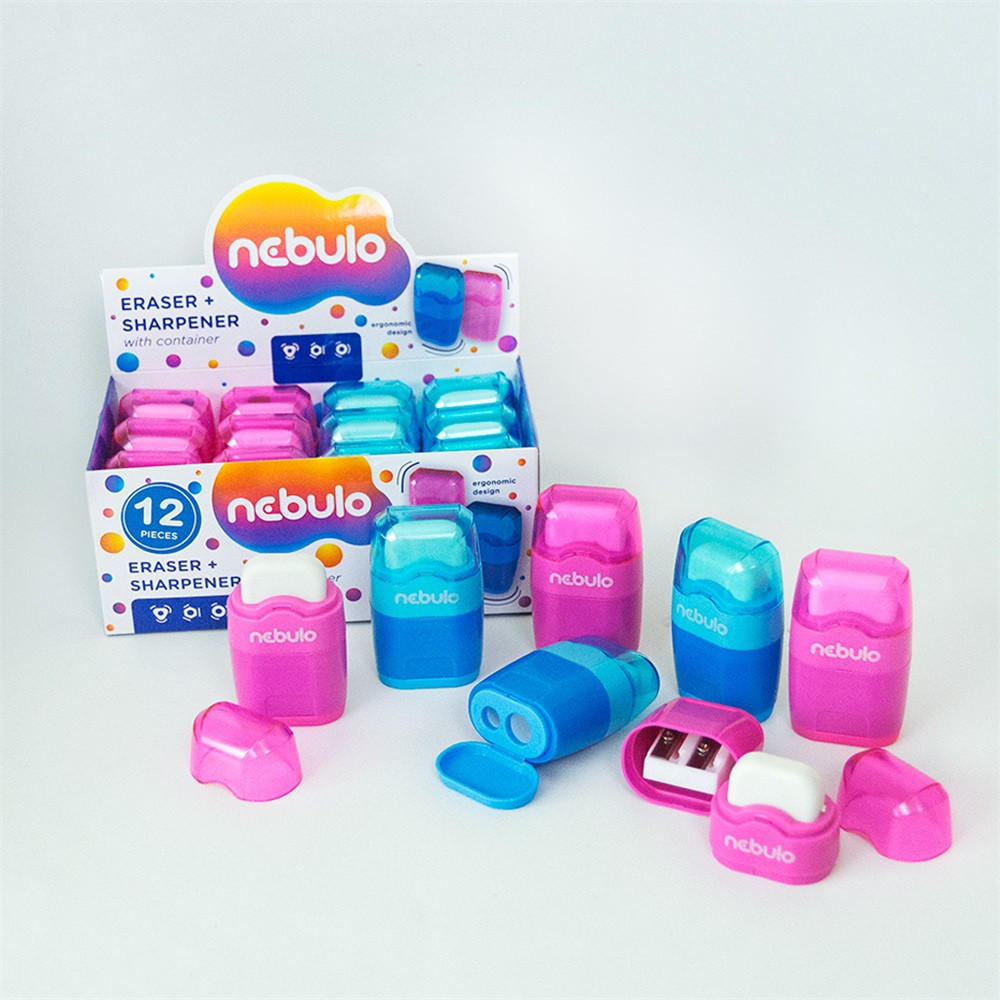 Hegyező 2 lyukú műanyag, tartályos+radír egyben 12 db/doboz, Nebulo vegyes színek