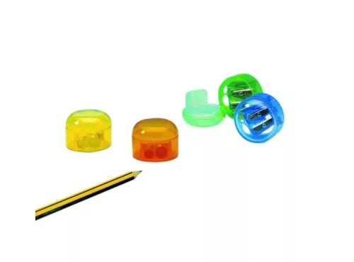 Áttetsző, színes műanyagból készült 2 lyukú hegyező, 8 és 11 mm-es ceruzákhoz, forgácsgyűjtő tartállyal. Méret: 4,2 x 4,2 x 3,2 cm.