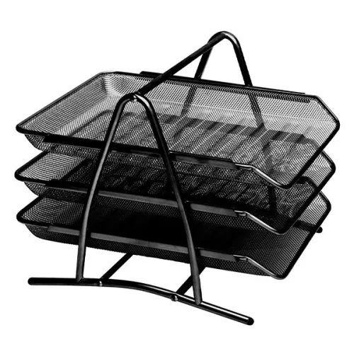 Fémhálós kivitelű háromszintes irattartó tálca, A/4 -es méretű iratok tárolására. Színek: fekete, ezüst.