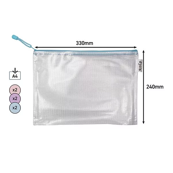 Rendkívül tartós, félig átlátszó, rugalmas hálóval erősített, tartós PVC tasak vonzó, pasztell színekben. Dokumentumok, írószerek, apró tárgyak akár tematikus rendszerezésére is alkalmas. A fém cipzáron lévő, színes zsinór megkönnyíti a használatot. Oldalán található, logós hurok toll tartására alkalmas. Formátuma: A4, külső mérete: 240 × 330 mm; tetején cipzárral. Anyaga: hálóval erősített, tartós PVC (230 µm) Pasztell színek vegyesen: sárga, rózsaszín, kék. Szakadásbiztos, REACH-kompatibilis, ftalát mentes. Szín nem választható!