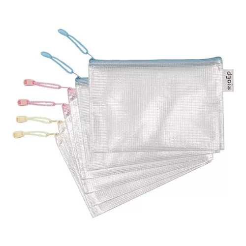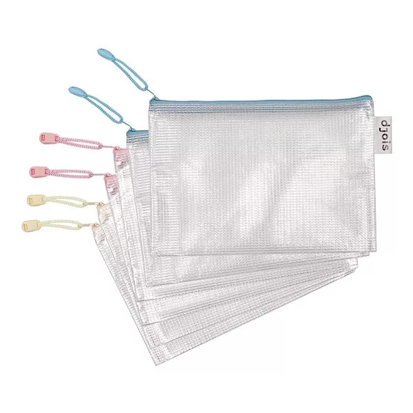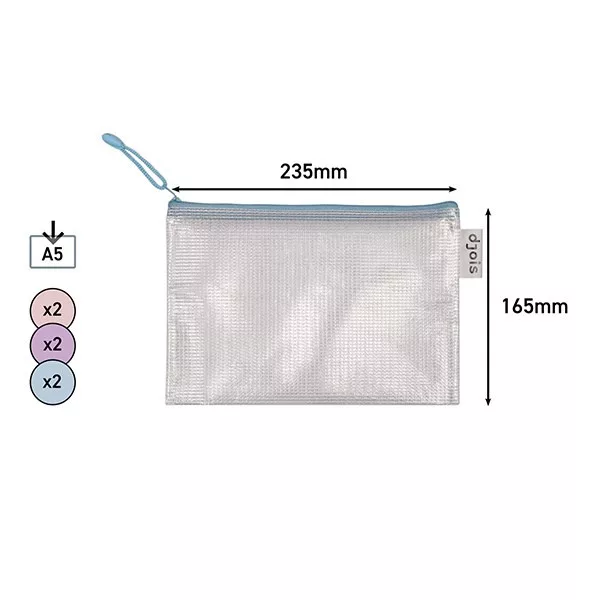 Rendkívül tartós, félig átlátszó, rugalmas hálóval erősített, tartós PVC tasak vonzó, pasztell színekben. Dokumentumok, írószerek, apró tárgyak akár tematikus rendszerezésére is alkalmas. A fém cipzáron lévő, színes zsinór megkönnyíti a használatot. Oldalán található, logós hurok toll tartására alkalmas. Formátuma: A5, külső mérete: 235 × 165 mm; tetején cipzárral. Anyaga: hálóval erősített, tartós PVC (230 µm), pasztell színek vegyesen: sárga, rózsaszín, kék. Szakadásbiztos, REACH-kompatibilis, ftalát mentes. Szín nem választható.