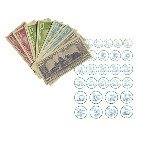• a csomag tartalma: 20.000 1 db, 10.000 2 db, 5000 4 db, 2000 5 db, 1000 5 db, 500 2 db, 2 lap aprópénz