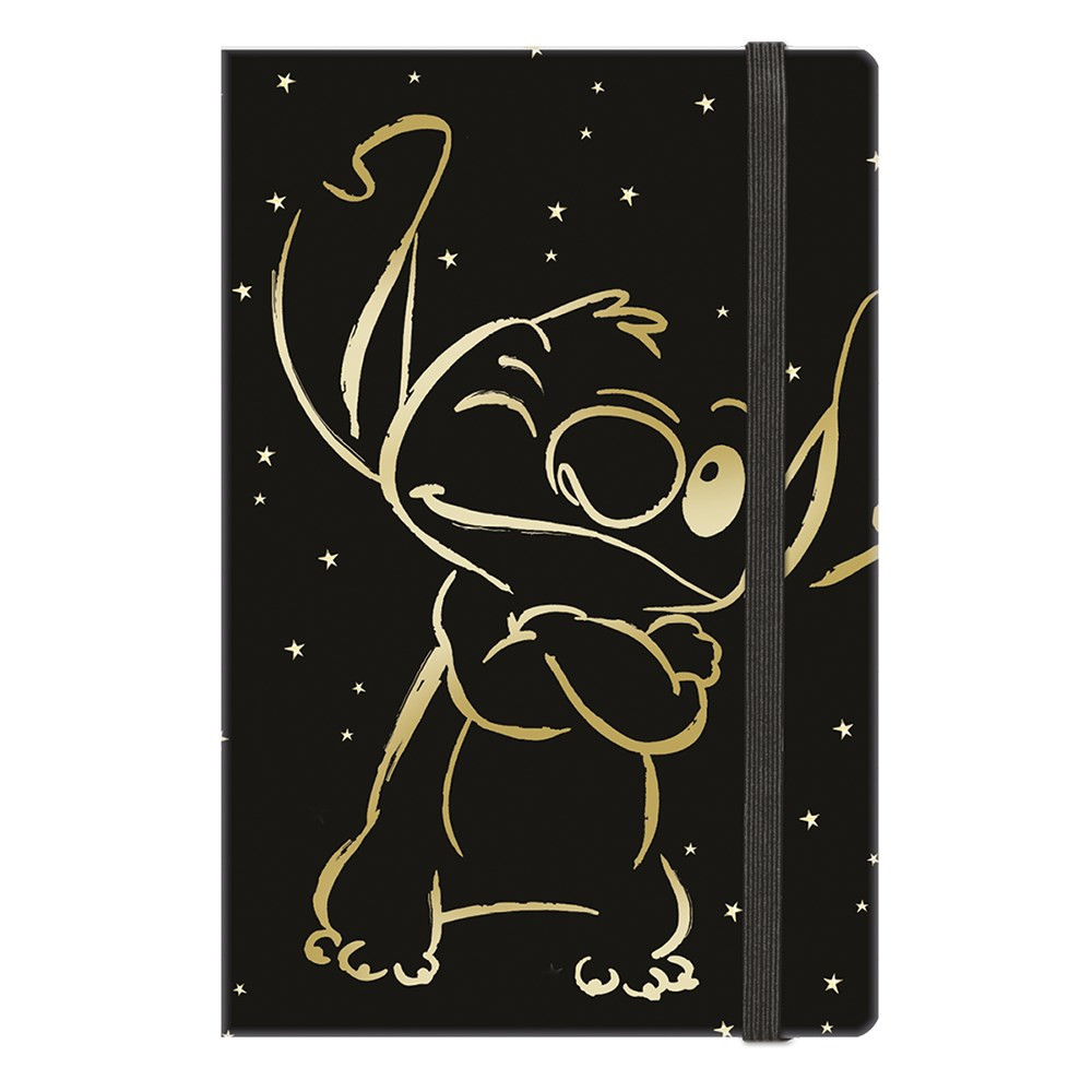 Erős, karton alapú, párnázott borítású jegyzetfüzet lapos gumiszalagos záródással. Külső borítása ellenáll a kisebb sérüléseknek, karcolódásoknak. Fehérített, vonalas lapokkal és egy kis Stitch díszítéssel a lapok jobb alsó sarkában. Használhatjuk mindennapi jegyzetekhez, napi feladatokhoz vagy naplóként egyaránt.