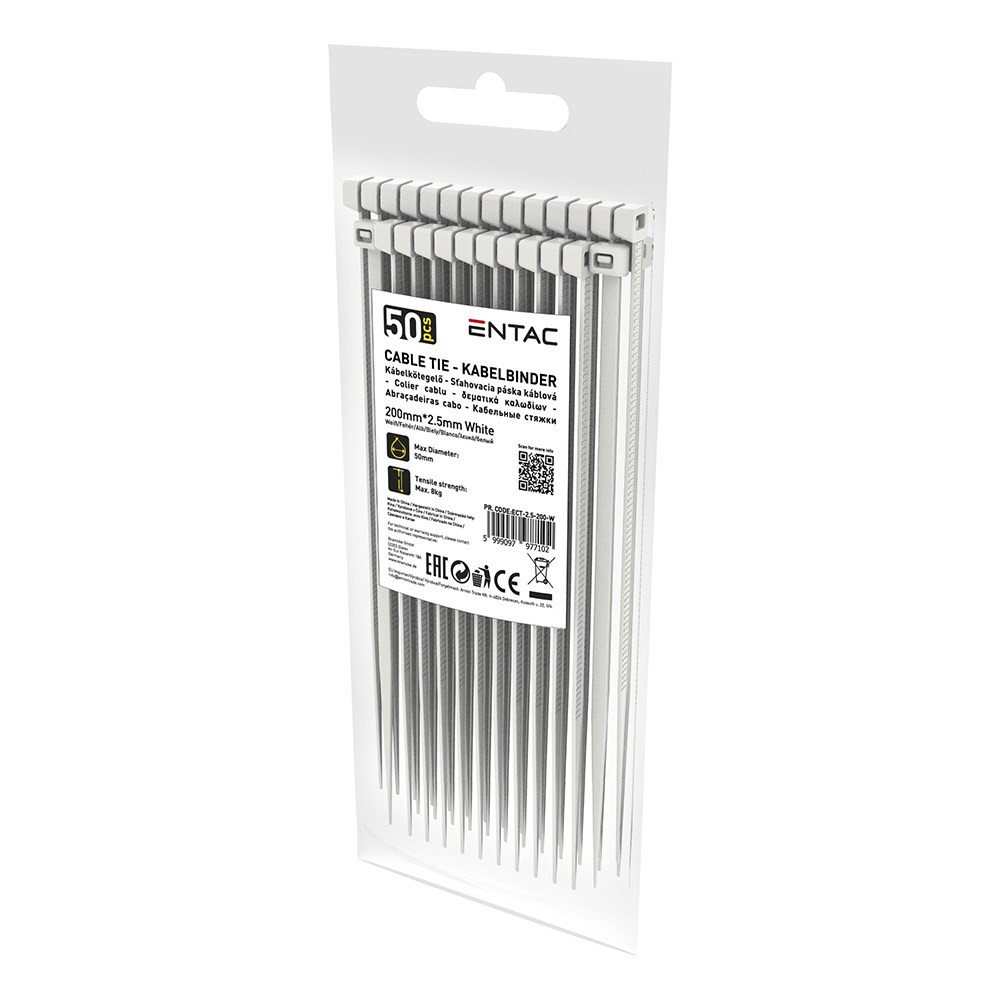 Kábelkötegelő-gyorskötöző ENTAC 200mm x 2,5mm fehér 50 darabos