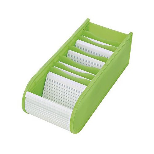 Műanyag asztali kartotékozó, 6 műanyag elválasztóval, 100 ív A/8 méretű( 52mm x 73 mm) vonalas betétlappal. 500 db kártya tárolására alkalmas. Külső mérete: 8,9 x 21,5 x 7,3 cm.