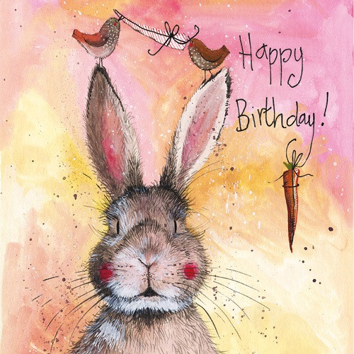 Képeslap Alex Clark borítékkal, 14x14 cm, nyuszi madárral HBD