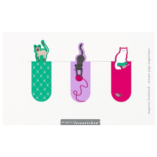 Ez a szett három divatos és életvidám témájú mágneses könyvjelzőt tartalmaz, amelyek tökéletesek a könyvek szerelmeseinek. A könyvjelzők különböző vidám mintákkal díszítettek: az egyik zöld háttérrel és mancs mintákkal, macskával a tetején, a másik lila alapon pöttyökkel és egy fonalgombolyaggal játszó cicával, a harmadik pedig rózsaszín alapon egy fehér macskával és egy kisegérrel. Ezek a színes és játékos témájú könyvjelzők feldobják az olvasás élményét.