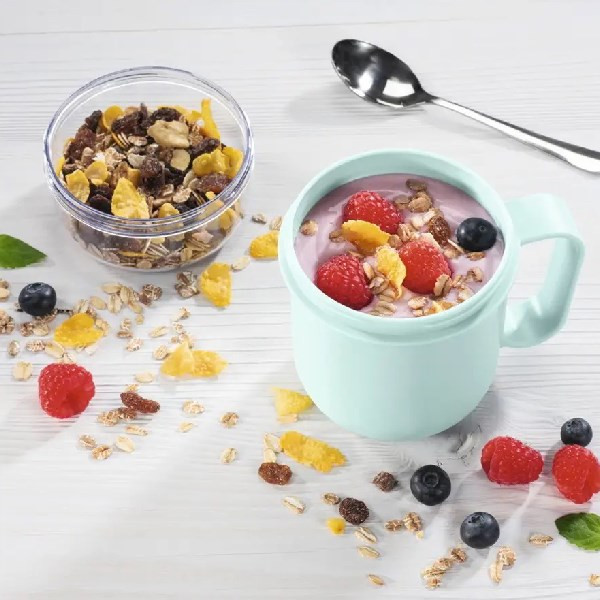 A hordozható bögre poharában és a felső tartályban tárolt étel a szállítás során nem keveredik össze.