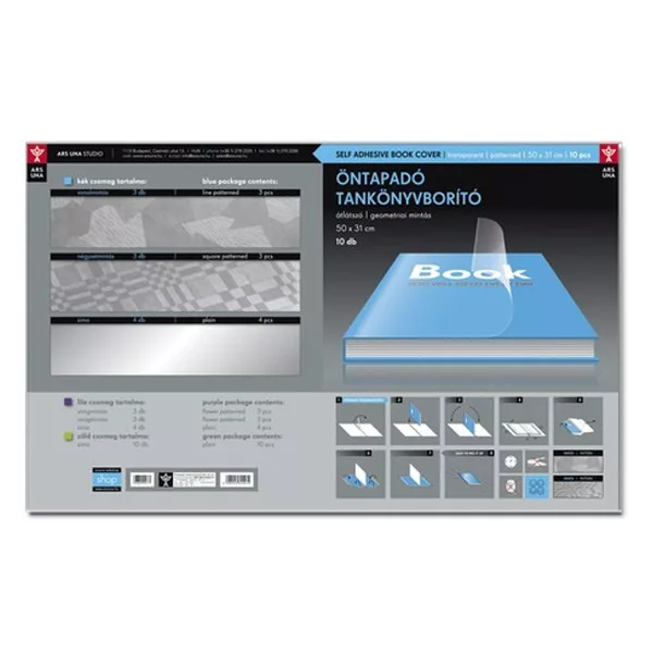 Öntapadós műanyag tankönyvborító, 50x33 cm méretű. Egy csomag 10 db átlátszó borítót tartalmaz. Méretre vágható. Tankönyvekhez és füzetekhez is használható.