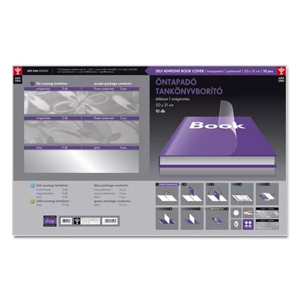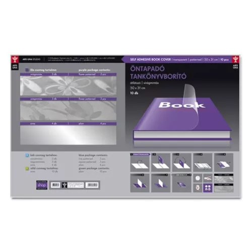Öntapadós műanyag tankönyvborító, 50x33 cm méretű. Egy csomag 10 db átlátszó borítót tartalmaz. Méretre vágható. Tankönyvekhez és füzetekhez is használható.