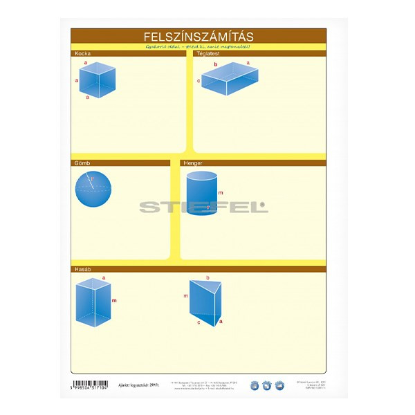 A felszínszámítás áttekintése szemléletes rajzokkal, amelyek segítenek a tanultak rögzülésében. Hátoldalán egyszerű számításokkal.
