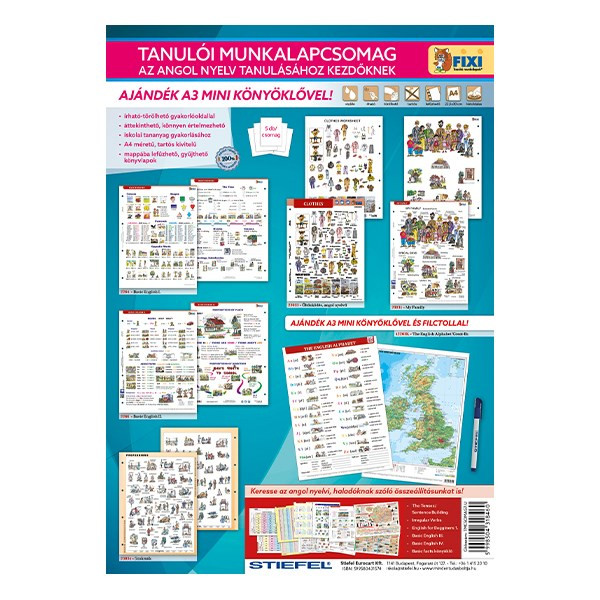 5 db tanulói lap 1 db Angol abc alátéttel és kék filctollal. A Fixi tanulói munkalapok a magyar oktatásban széleskörűen használt falitérképek és oktatótablók kicsinyített másai, nemcsak az órai munkát, hanem az otthoni gyakorlást is megkönnyítik. Minden munkalap írható-letörölhető, cseppálló fóliabevonattal készül, a lyukasztás pedig megkönnyíti a gyűjtését és tárolását a lapoknak. Az A3 méretű alátéten az Angol abc, hátoldalán Nagy-Britannia térképe található.