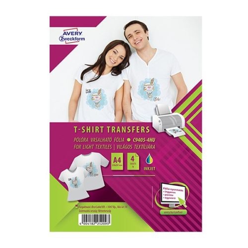 Textilre vasalható fólia AVERY C9405-4HU világos pólóra vasalható tintasugaras nyomtatóhoz (4ív/doboz)