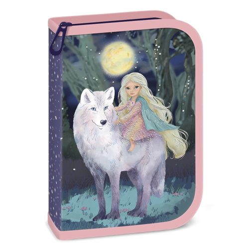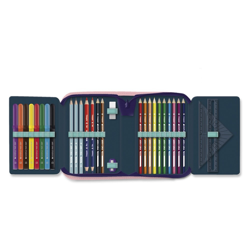 Írószerekkel töltött cipzáros tolltartó két kihajtható füllel, gumis kialakítással az írószerek tárolásához. Tartalma: 12 db színes ceruza, 3 db HB grafit ceruza, 1 vékony és 1 vastag postairón, 8 db színes filctoll, 1 db radír, 1 db hegyező, 1 db 17 cm-es egyenes vonalzó, 1 db háromszög vonalzó, órarend A és B hétre.