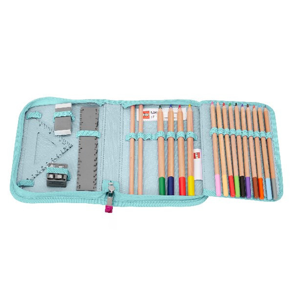 Ez a tolltartó minden szükséges eszközt tartalmaz, ami az iskolába szükséges lehet. A tolltartó CE tanúsítvánnyal rendelkezik; 2 ceruza, 10 színes ceruza, 4 vastag színes ceruza, radír, ceruzahegyező, vonalzó és háromszög is megtalálható benne. A tolltartó kitölthető órarenddel és belső névtáblával rendelkezik, amely megkönnyíti az azonosítást. Tartós PVC-mentes anyagból készült.