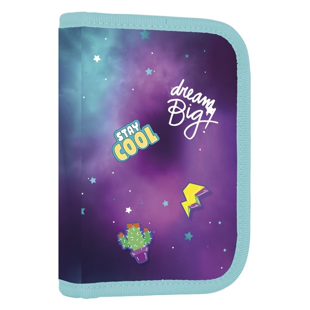 Egyszintes iskolai tolltartó 2 kihajtható füllel, üres. 25 gumipántot tartalmaz az írószerek rögzítéséhez. A belső füleken átlátszó fólia található az órarend számára.