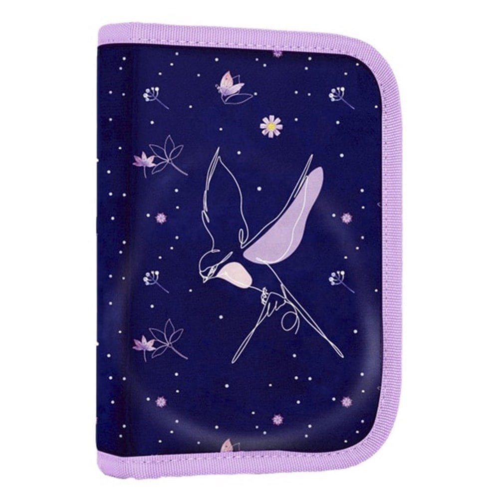 Egyszintes iskolai tolltartó 2 kihajtható füllel, üres. 25 gumipántot tartalmaz az írószerek rögzítéséhez. A belső füleken átlátszó fólia található az órarend számára.