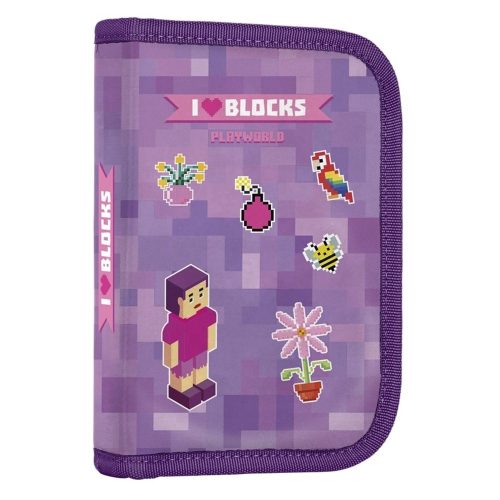 Egyszintes iskolai tolltartó 2 kihajtható füllel, üres. 25 gumipántot tartalmaz az írószerek rögzítéséhez. A belső füleken átlátszó fólia található az órarend számára.