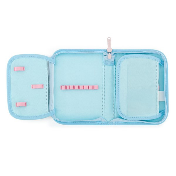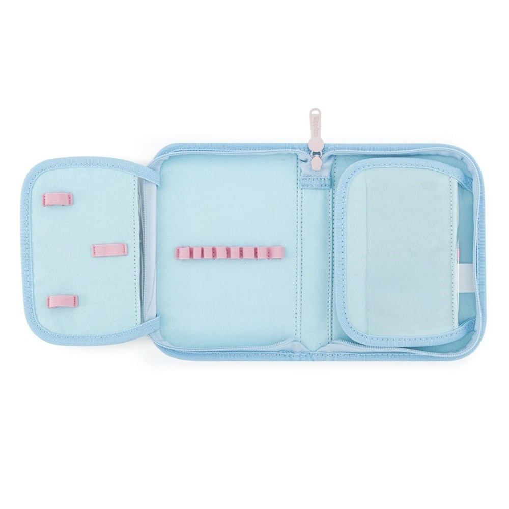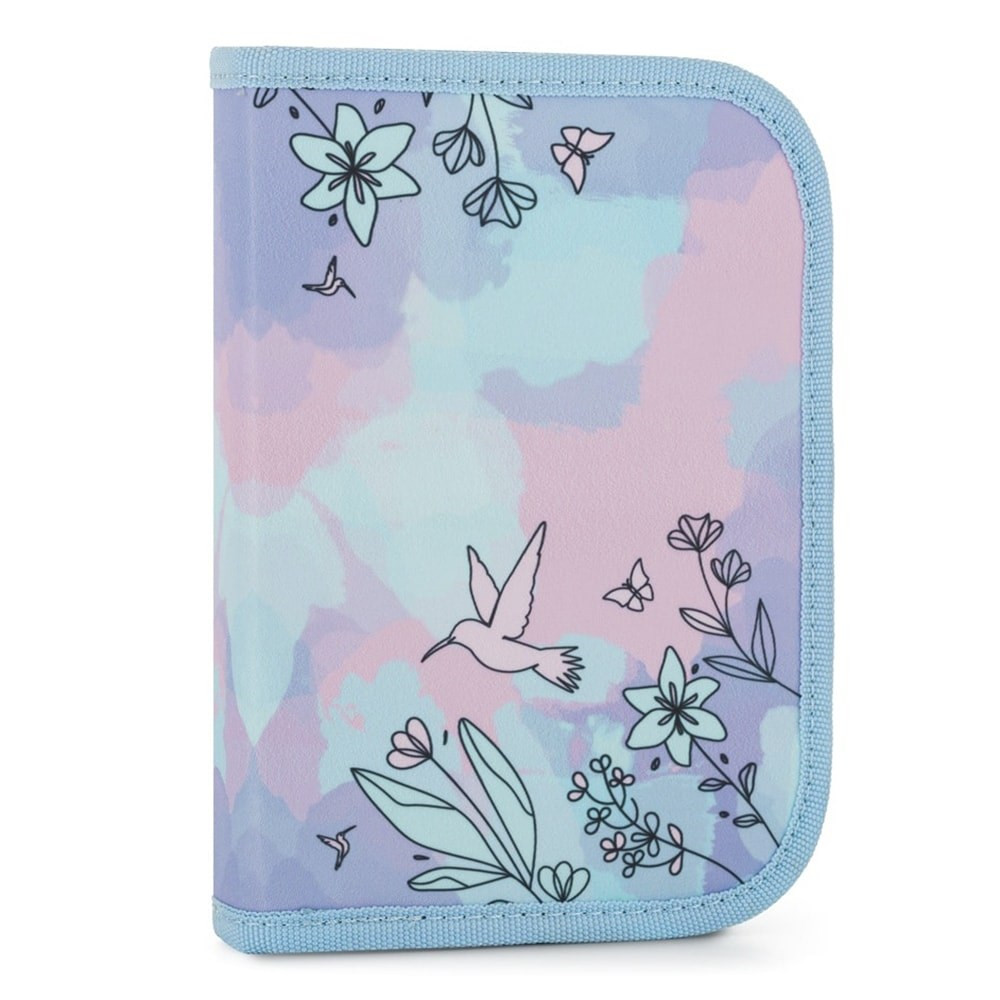 Egyszintes iskolai tolltartó 2 kihajtható füllel, üres. 25 gumipántot tartalmaz az írószerek rögzítéséhez. A belső füleken átlátszó fólia található az órarend számára.