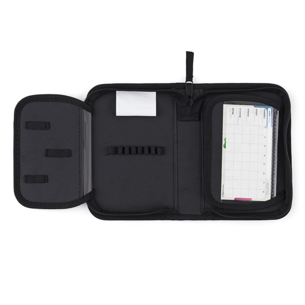 Egyszintes iskolai tolltartó 2 kihajtható füllel, üres. 25 gumipántot tartalmaz az írószerek rögzítéséhez. A belső füleken átlátszó fólia található az órarend számára.