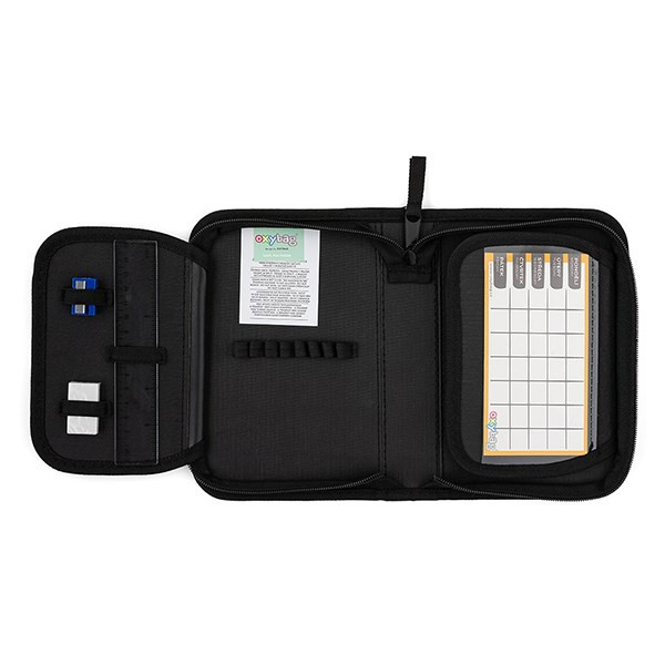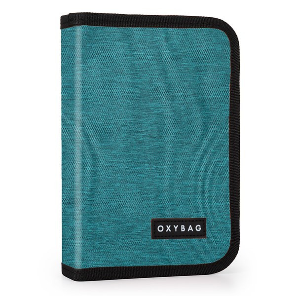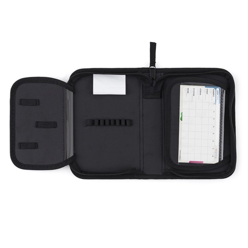 Egyszintes iskolai tolltartó 2 kihajtható füllel, üres. 25 gumipántot tartalmaz az írószerek rögzítéséhez. A belső füleken átlátszó fólia található az órarend számára.