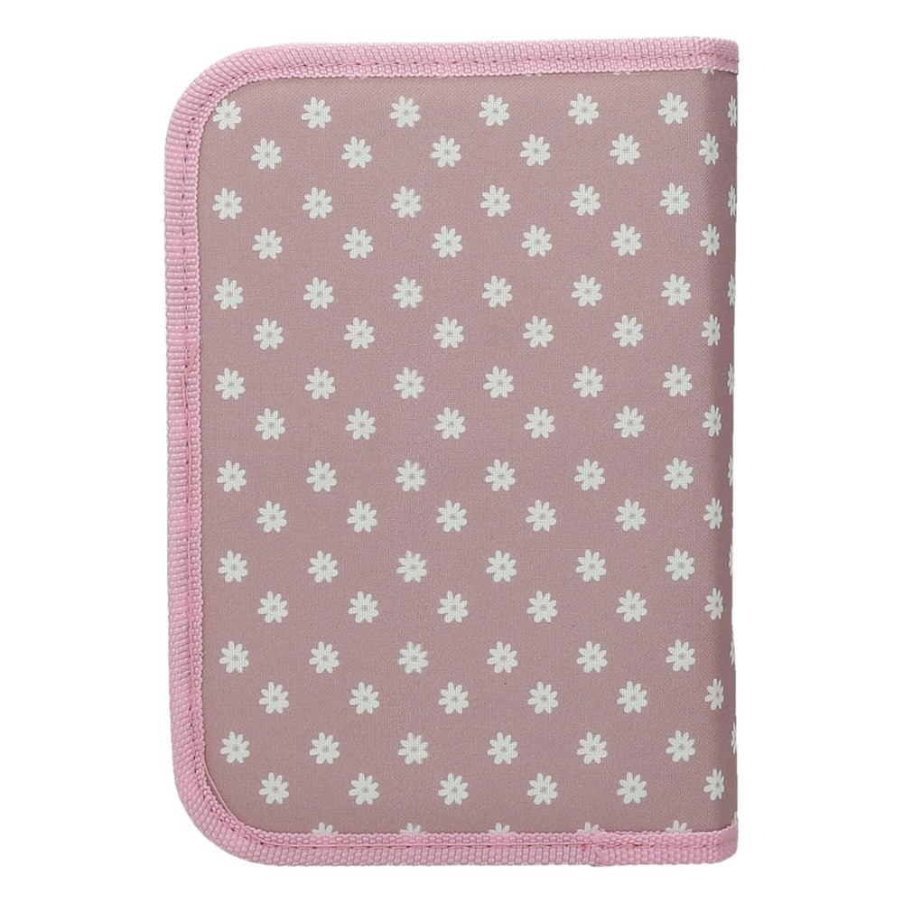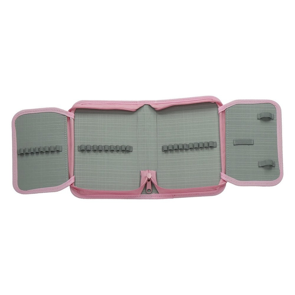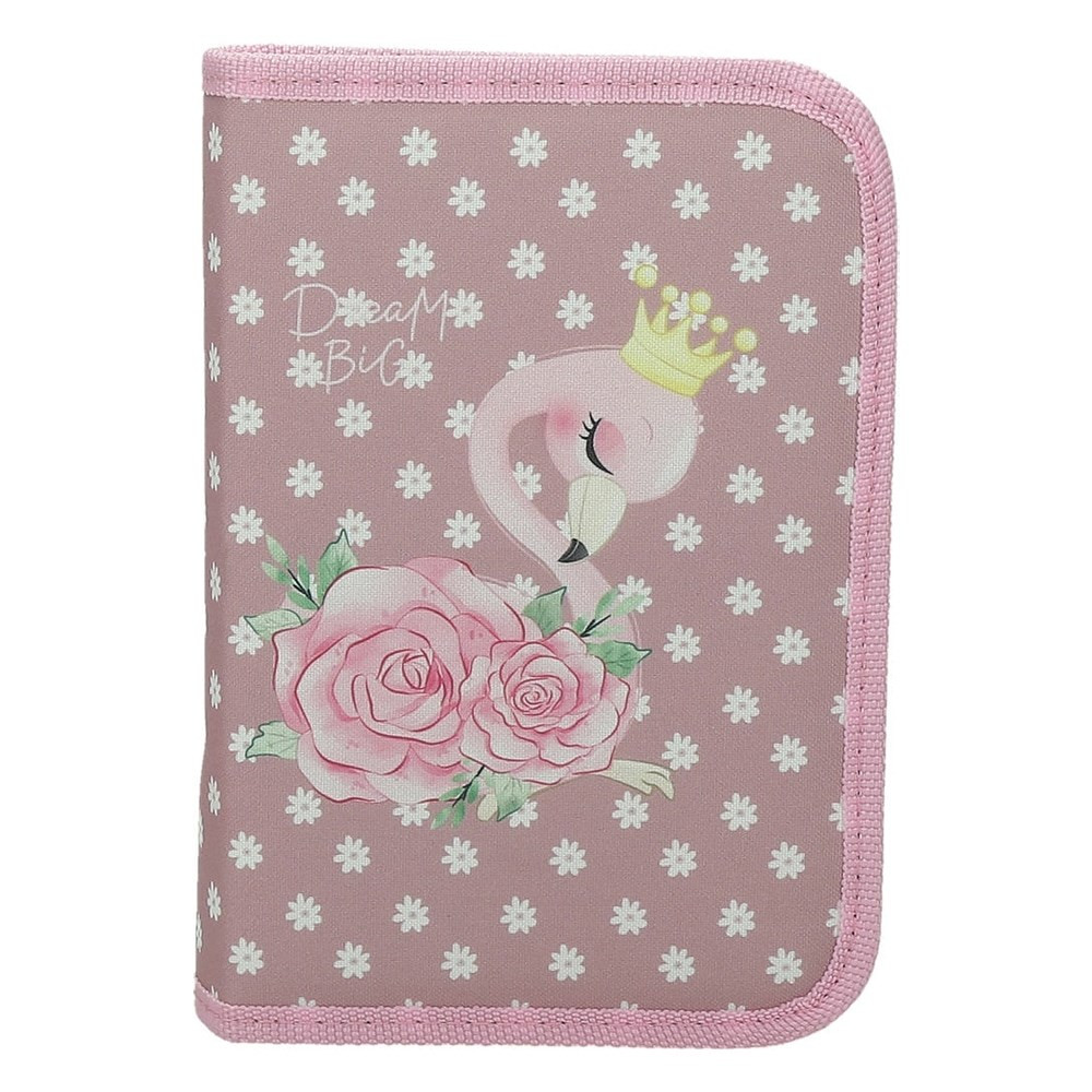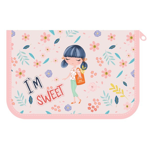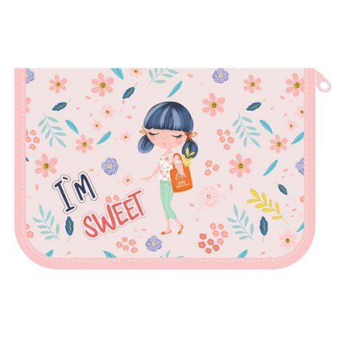 Egyszintes, írószerekkel töltött, két kihajtható füllel, cipzáros tolltartó gumis kialakítással az írószerek tárolásához.