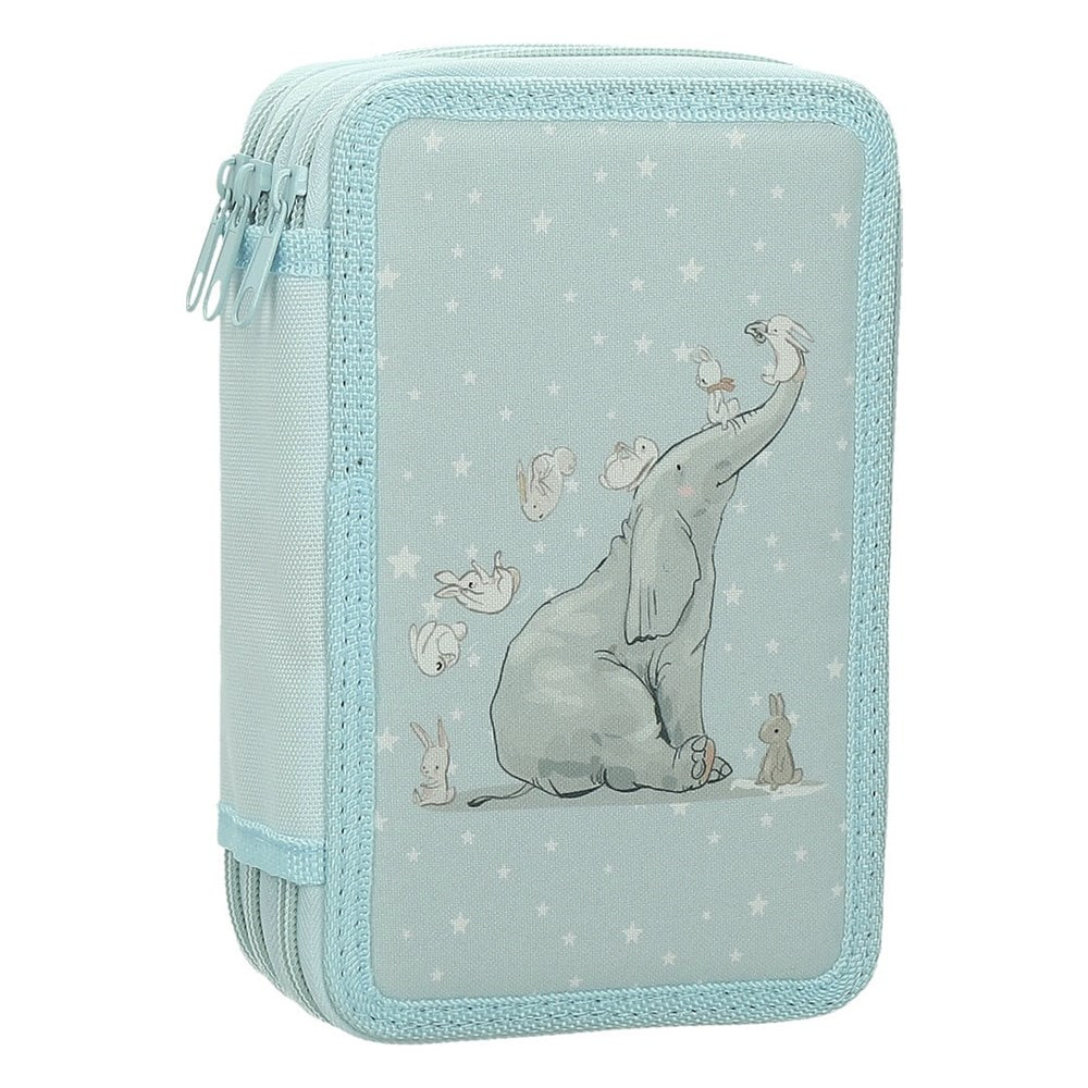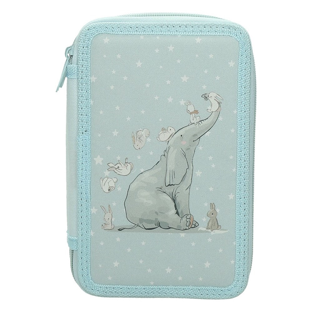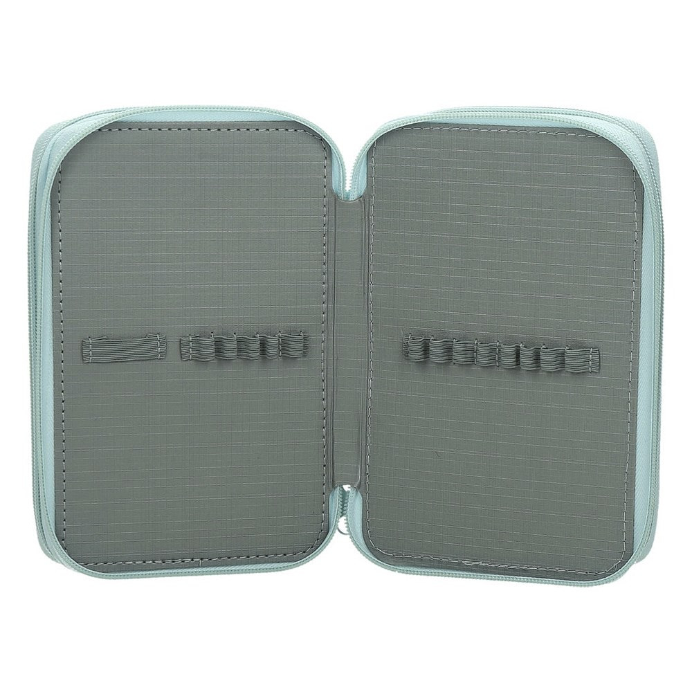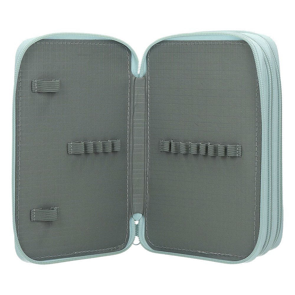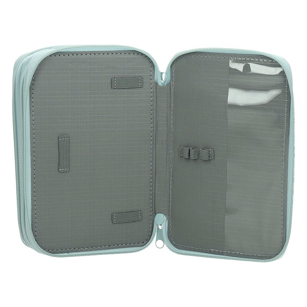 Többszintes, írószerekkel töltött cipzáros tolltartó gumis kialakítással az írószerek tárolásához.