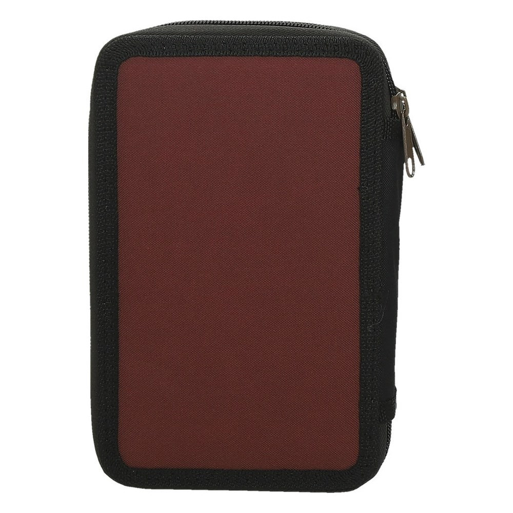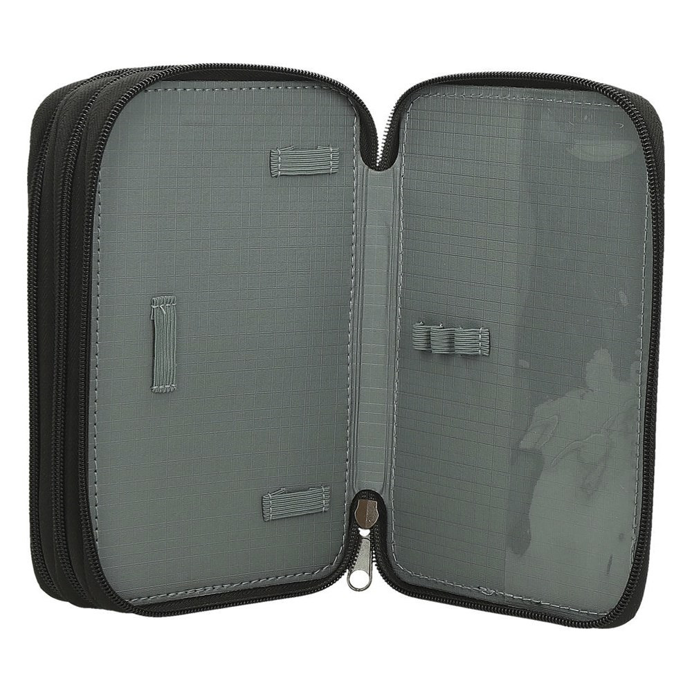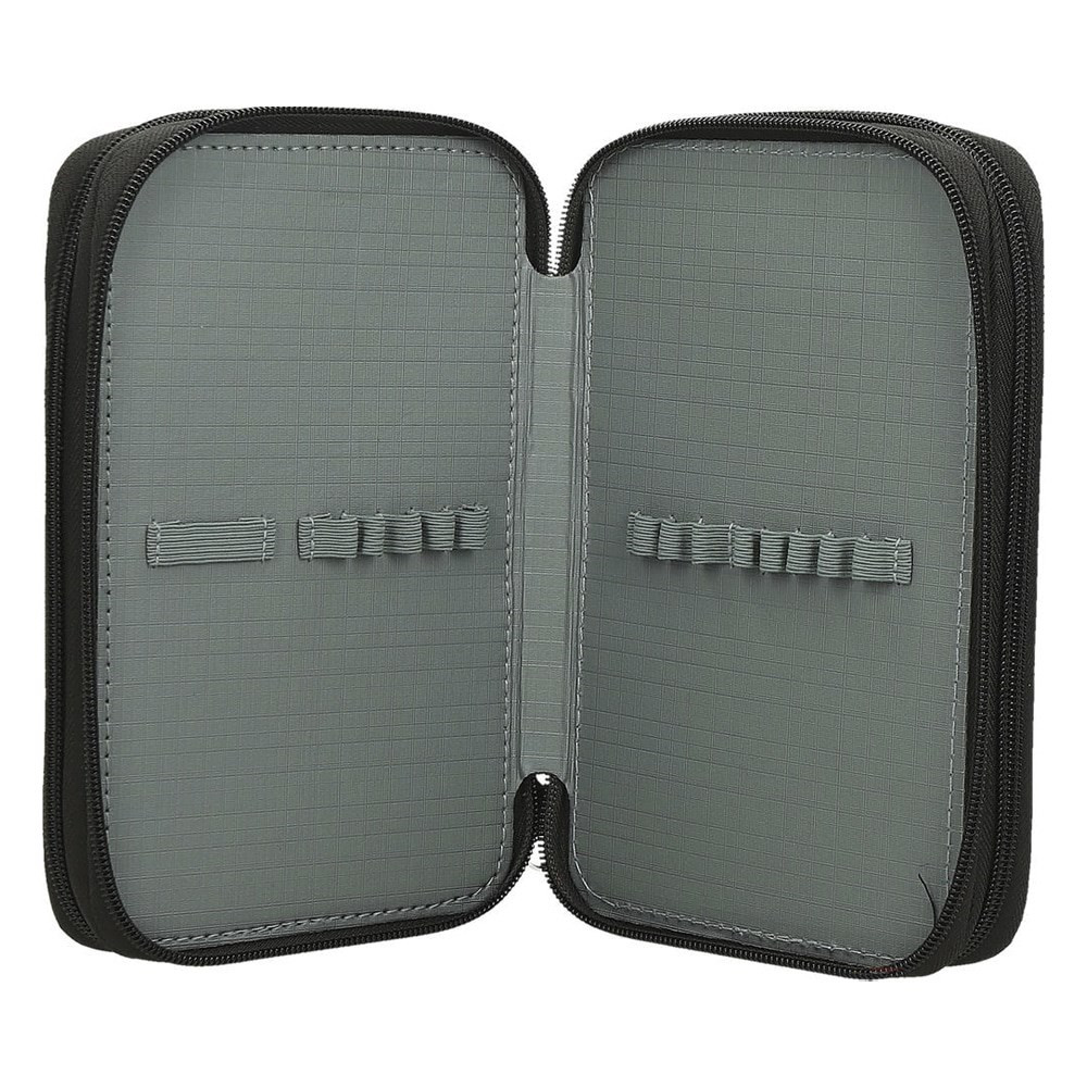 Belül textillel bevont merev lapokkal, gumis kialakítással az írószerek tárolásához, és egy cipzáras belső zsebbel.