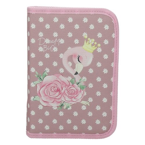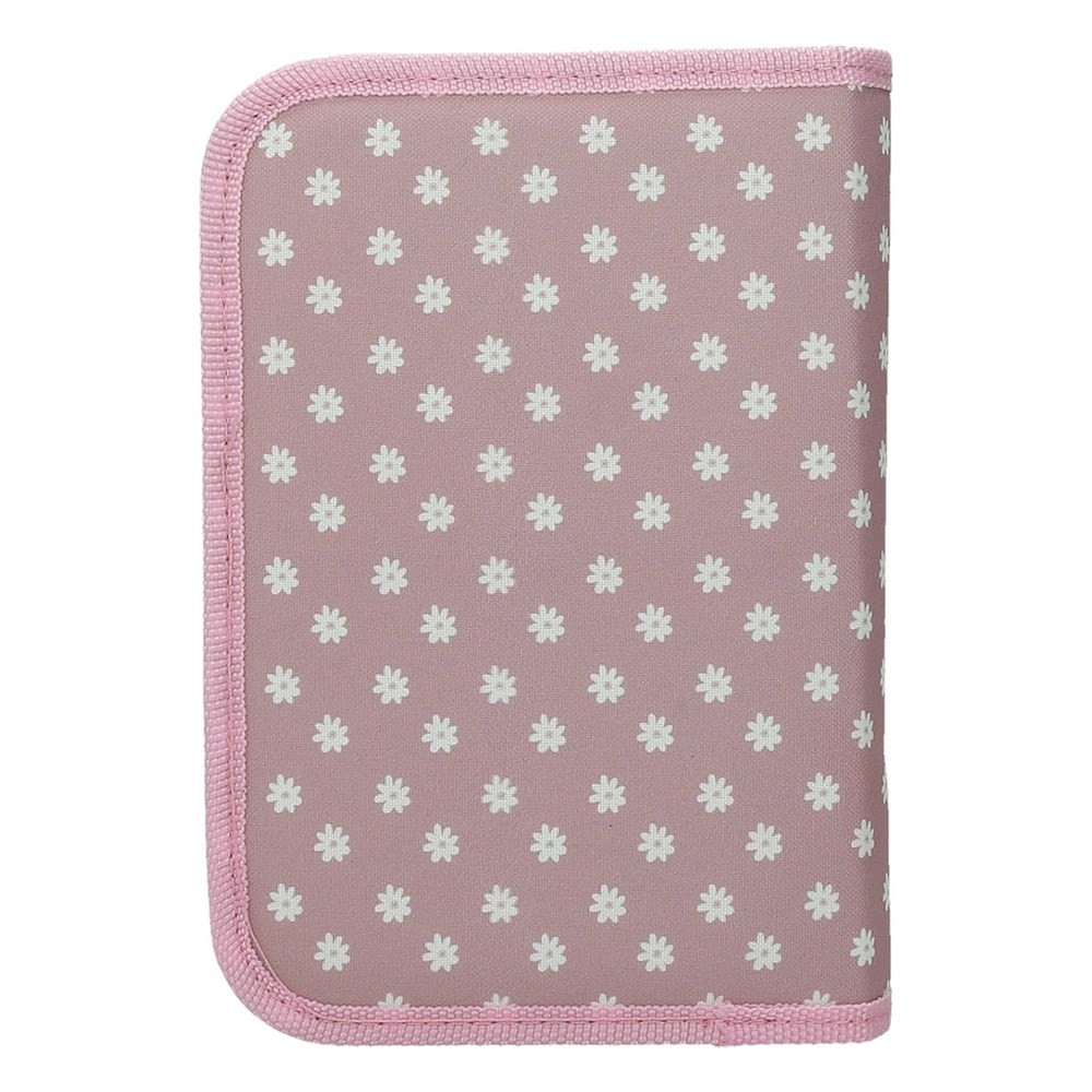 Belül textillel bevont merev lapokkal, gumis kialakítással az írószerek tárolásához, és egy cipzáras belső zsebbel.