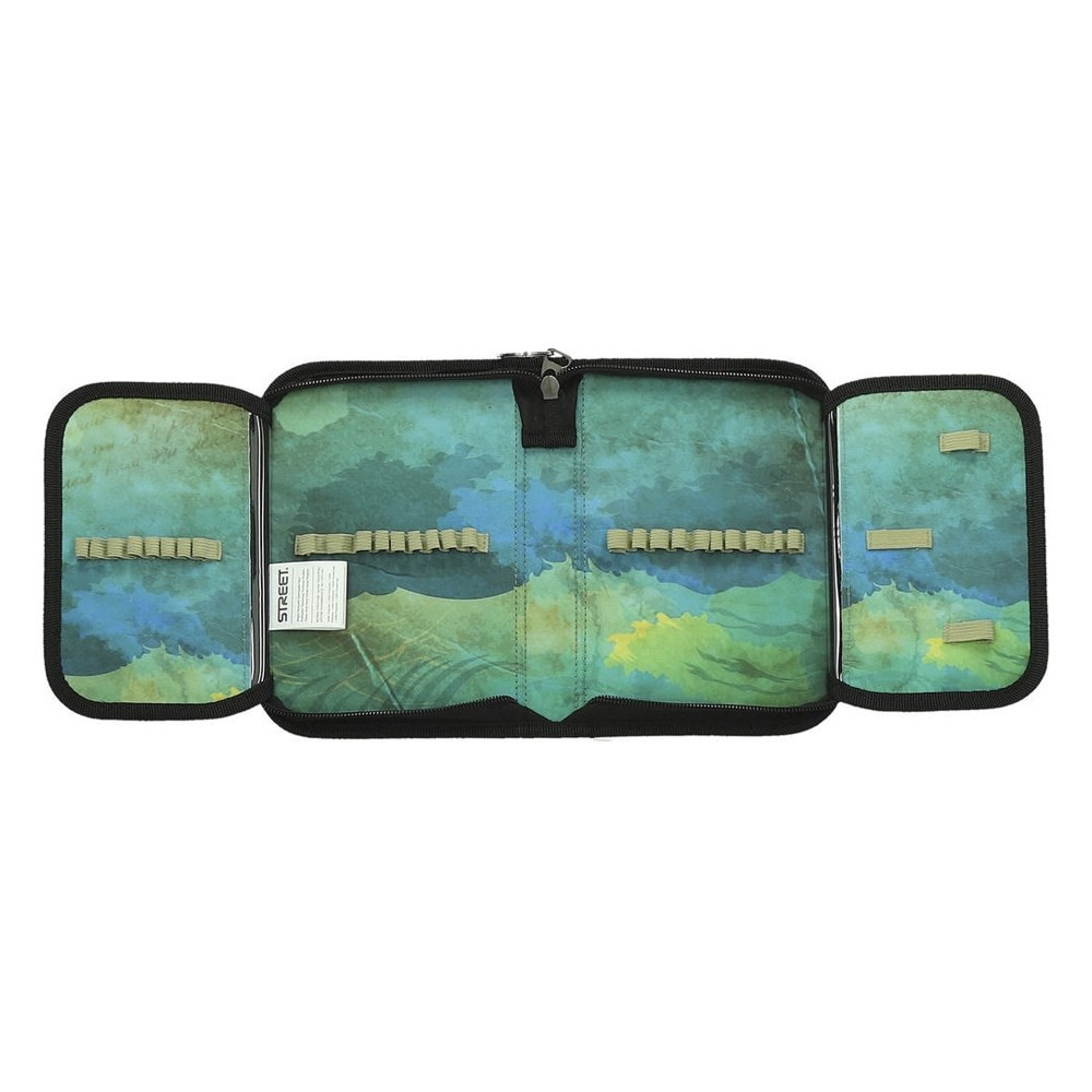 Belül textillel bevont merev lapokkal, gumis kialakítással az írószerek tárolásához.