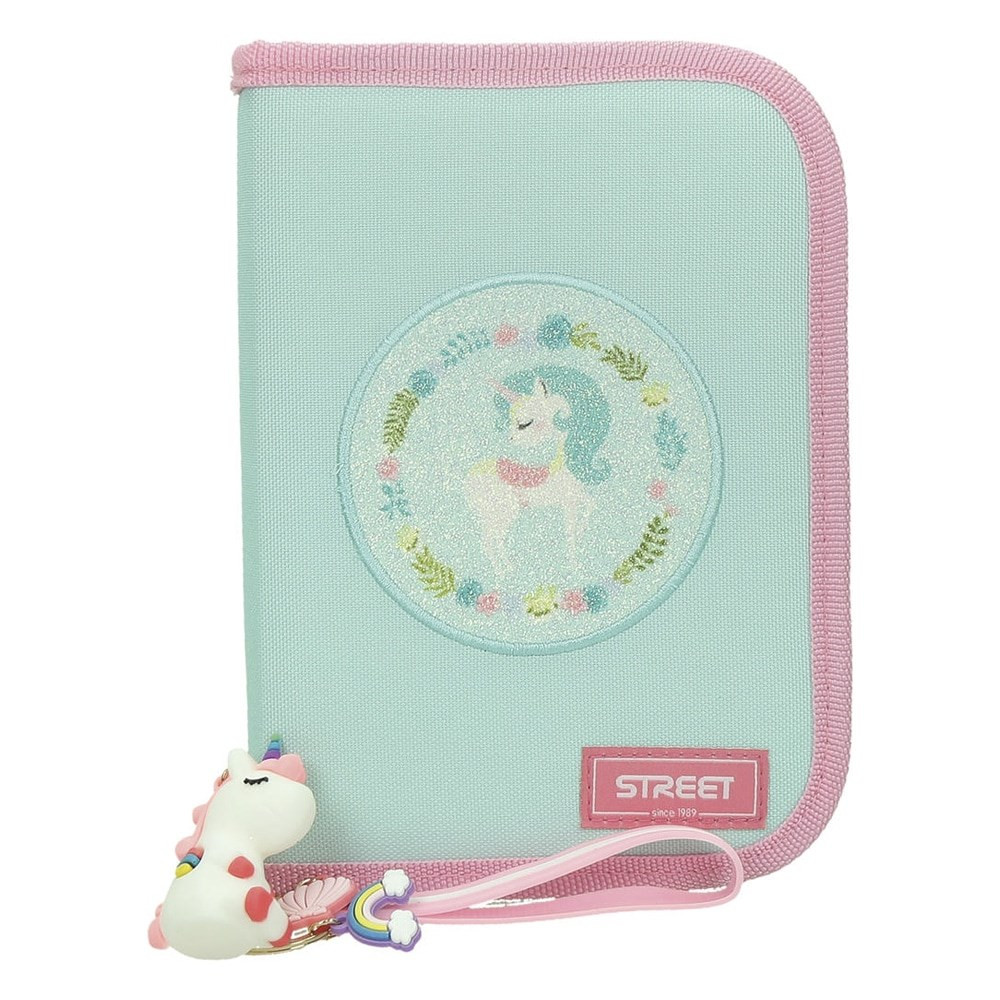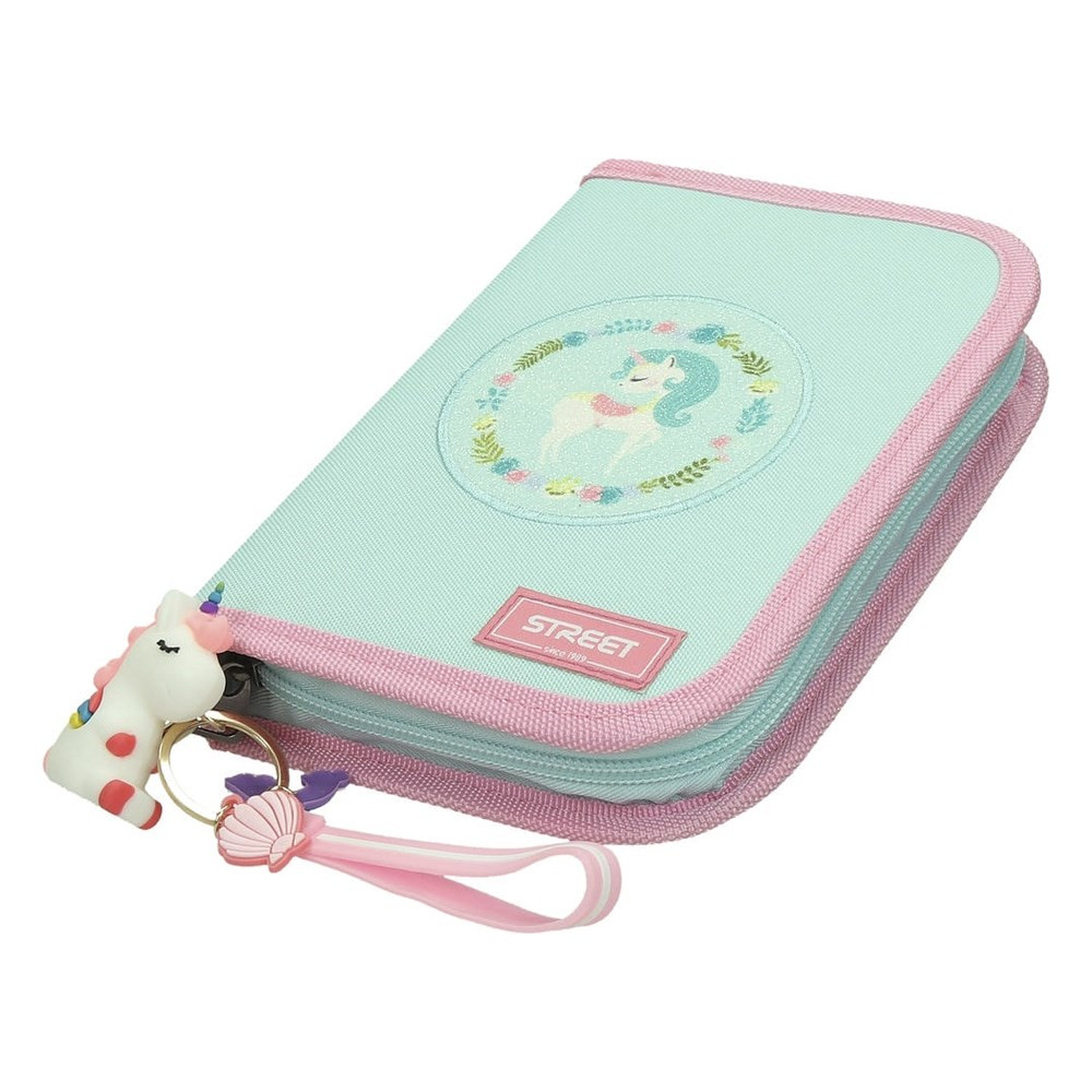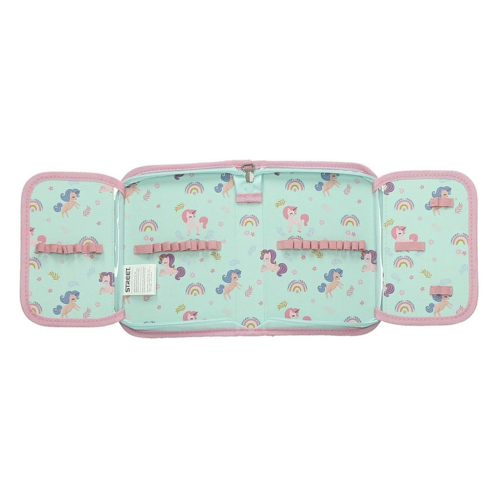 Belül textillel bevont merev lapokkal, gumis kialakítással az írószerek tárolásához.