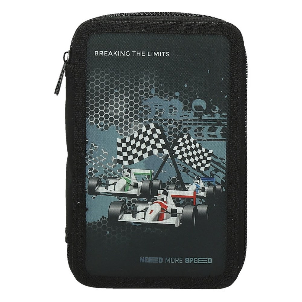 Többszintes, írószerekkel töltött cipzáros tolltartó gumis kialakítással az írószerek tárolásához.