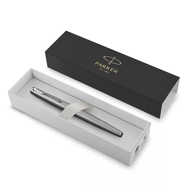 Rozsdamentes acél tolltest, kupak és hegy, krómszínű kiegészítőkkel, díszdobozos csomagolásban.