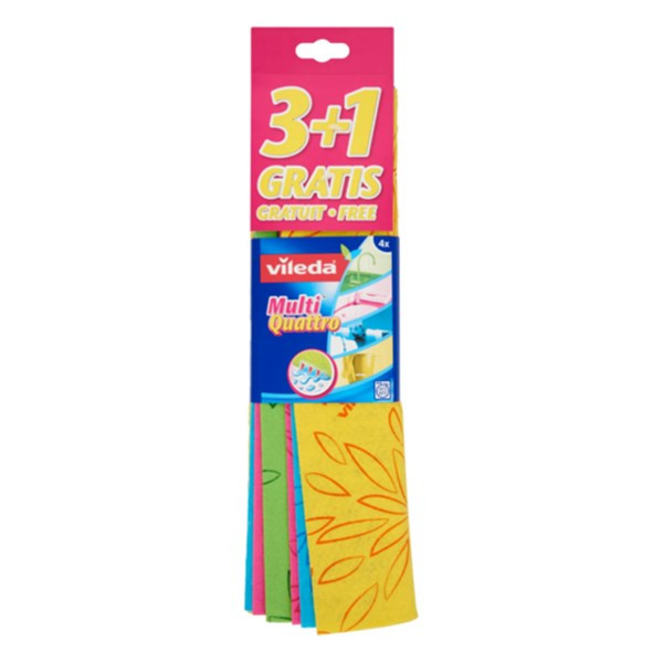 A Vileda Multi Quattro 3+1 törlőkendő négy fiatalos színben kapható, mely akár 4 különböző helyiségben használható!