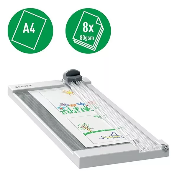 A Leitz Precision Home A4 görgős papírvágó tökéletes otthoni, kézműves vagy hobbi használatra, kártyák, ajándékok, meghívók, fotókollázsok és egyéb kézműves alkotások készítéséhez. Ez a könnyű és kompakt papírvágó könnyedén, gyorsan és precízen vág akár 8 A4-es papírlapot (80 g/m2), és használaton kívül könnyen tárolható. Az átlátszó vágóablak és vezetősín lehetővé teszi a penge vágási vonalának nyomon követését a mindig pontos vágás érdekében. Ergonomikus kialakítású vágófej a kényelmes használatért. A felhajtható papírrögzítő könnyű papírbehelyezést, míg az egyértelmű méretjelölések pontos lapigazítást tesznek lehetővé. Ez a kiváló minőségű, éles, edzett vágókéssel, masszív munkafelülettel és 2 év garanciával rendelkező papírvágó gép hosszantartó használatot biztosít.