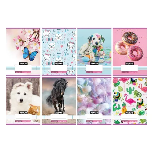 A/5-ös tűzött iskolai füzet 2. osztályos vonalazással, 32 lapos (16-32). 16 db füzet (8 különböző cuki minta, azaz 2db/minta) van egy csomagban. 70 g-os füzetlapok és 200 g-os műnyomó borító fényes fóliával.