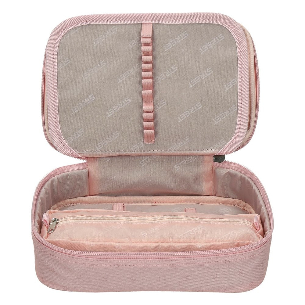 Belül textillel bevont merev lapokkal, gumis kialakítással az írószerek tárolásához.