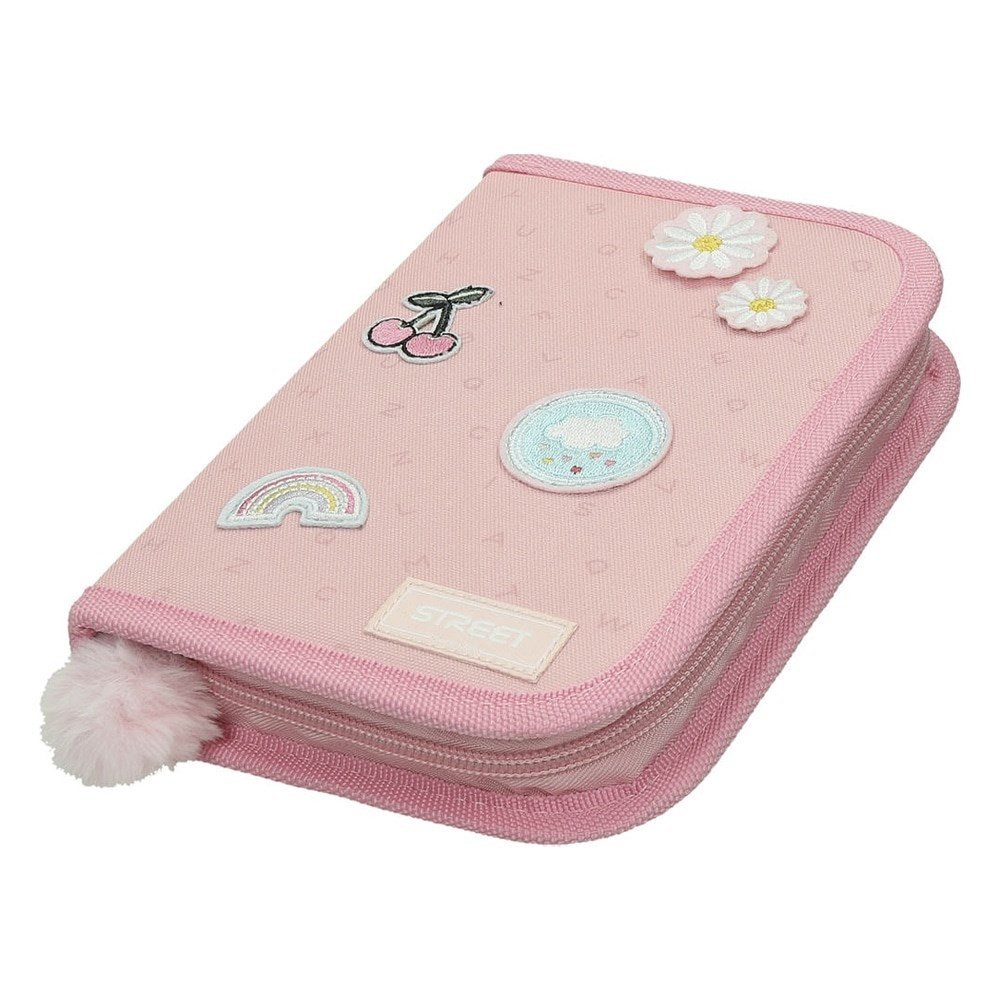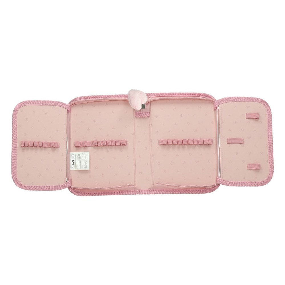 Belül textillel bevont merev lapokkal, gumis kialakítással az írószerek tárolásához.